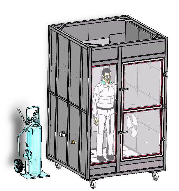 在使用时,先将人模穿上气密性防护服并放置在测试设备内部,并关上门。顶部固定密封膜并施加一定的重物压紧。