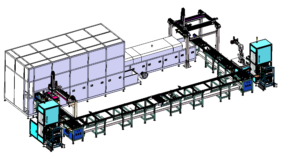 托盘机自动供料到清洗工装内,并由倍速线体输送至超声波清洗设备内进行超声清洗,清洗完成的产品再通过喷淋,风淋以及烘干功能处理流出生产线,最后由下料机器人下料至下料托盘机内部; 其中来料托盘,下料托盘等均需要人工参与处理,即工人需要根据设备的提示及时补偿满载托盘,清洗空托盘等一系列操作。